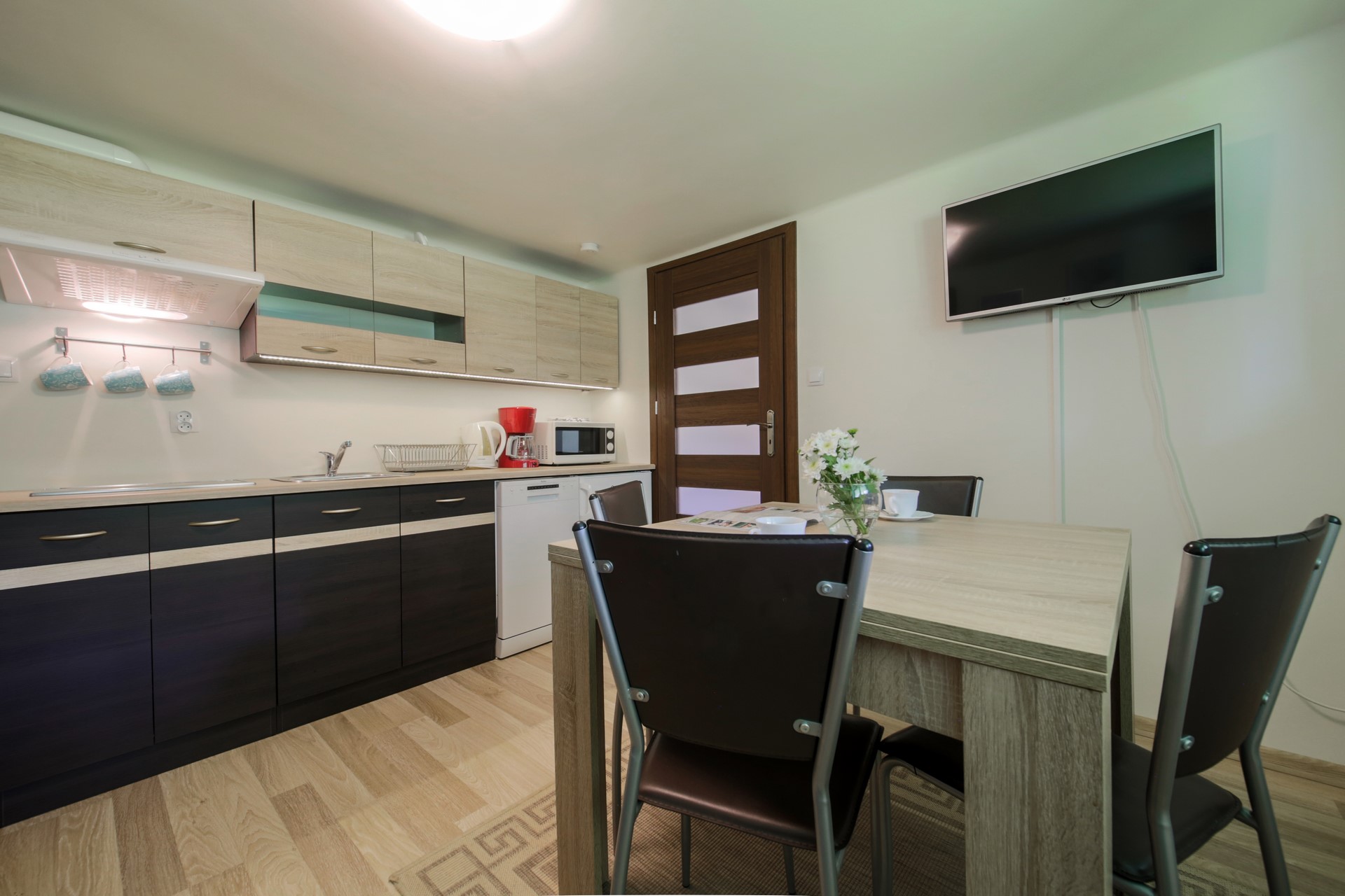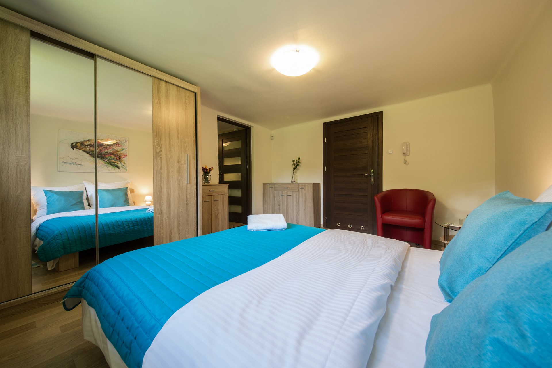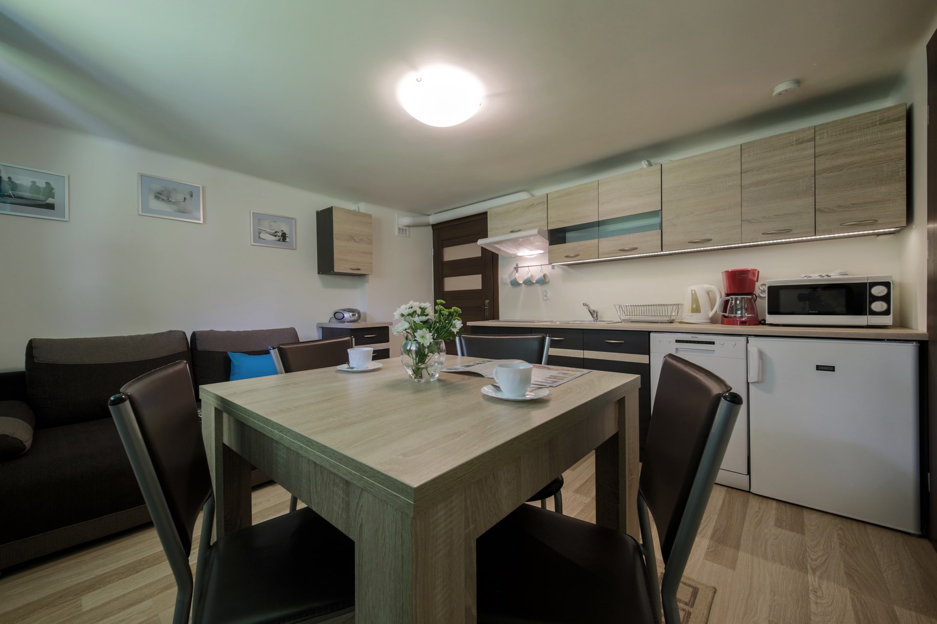 Nowoczesny, komfortowy apartament na parterze o powierzchni 30 m2, mogący pomieścić maksymalnie 6 osób. Idealnie sprawdzi się na wyjazd dla dwojga. Szczególnie polecany osobą starszym, ze względu na swoje dogodne usytuowanie. Jako jedyny w naszym obiekcie posiada łazienkę z wanną.