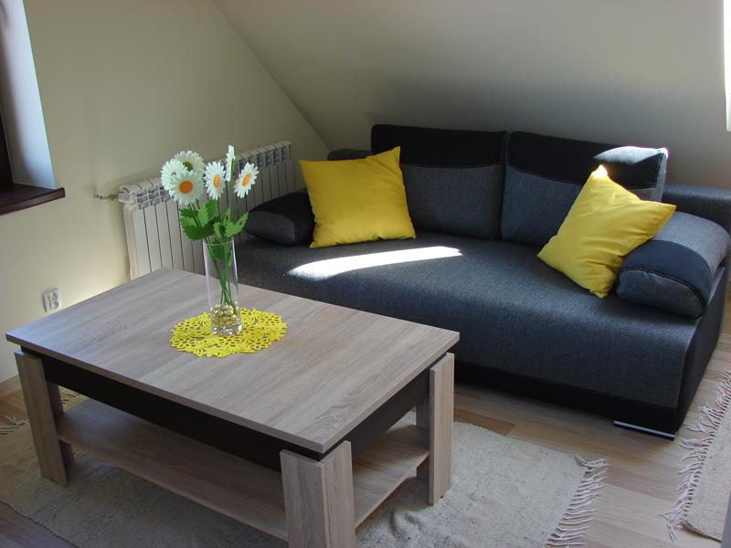 Część dzienna wyposażona jest w elegancką rozkładaną sofę z stolikiem kawowym oraz dodatkowym pojedynczym łóżkiem. W części sypialnianej znajduje się wygodne łoże małżeńskie.