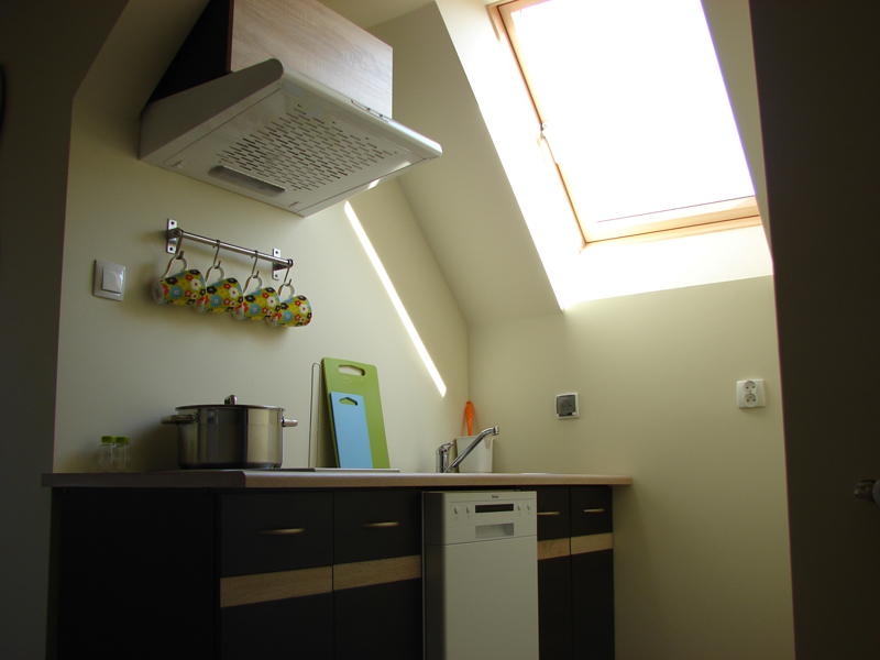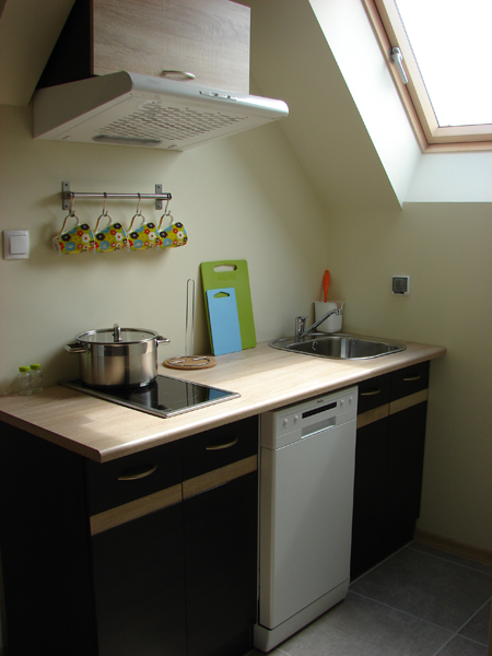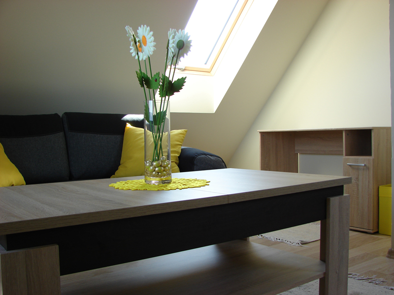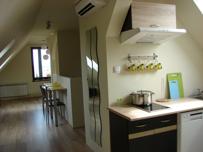 Przytulny 5 osobowy apartament składający się z kameralnej sypialni połączonej z pokojem dziennym, aneksu kuchennego oraz łazienki z prysznicem.
