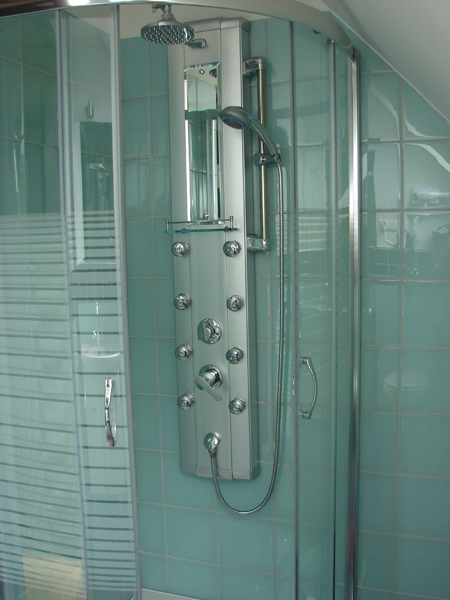 Łazienka z prysznicem wyposażonym w paanel do hydromasażu z kompletem ręczników
